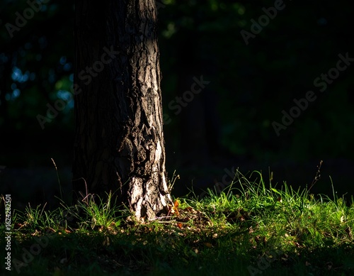 tree, trunk, bark, grass, sunlight, shadow, nature, forest, wood, green, plant, ground, illuminated, light, dark, peaceful, serene, tranquil, outdoors, growth, vibrant, fresh, environment, natural, beauty, bokeh, blurred, background, copy space, mysterious, calm, scene, texture, detail, foliage, flora, habitat, wilderness, sunbeam, contrast, brightness, organic, summer, spring, daylight, calmness, timberland, ecosystem