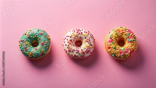 A trio of colorful donuts with sprinkles arranged in a row on a pink background