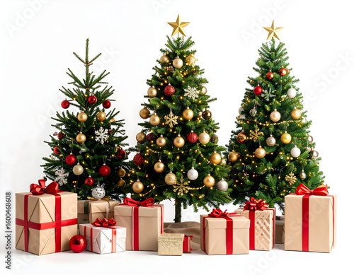festive, evergreen, tree, ornament, gift, christmas, holiday, celebration, seasonal, winter, joy, cheer, merry, decoration, bauble, light, star, red, gold, green, white, background, studio, isolated, present, wrapped, ribbon, bow, sparkle, bright, traditional, december, new, year, eve, party, family, home, indoor, display, arrangement, collection, trio, multiple, natural