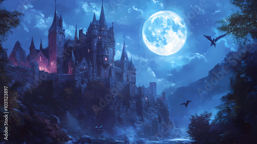 trio, sorcerer, dancing, front, moonlit, castle, captured, enchanting, painting, full, moon, light, behind, illuminating, pegasus, illustration