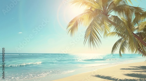 A tropical beach with palm trees and blue ocean.