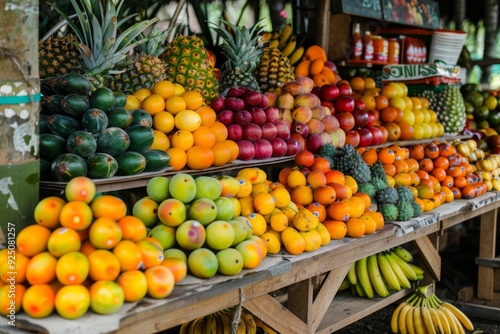 A tropical fruit stand with an array of colorful and exotic fruits Hyper realistic. Shot with canon 5d Mark III --ar 3:2 --style raw Job ID: 7aec5f34-07af-497e-ace1-92b5264ae10c