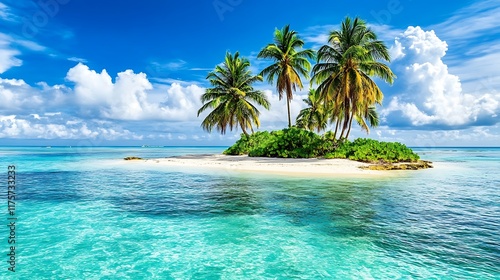 A tropical island with white sandy beaches, clear turquoise waters, and palm trees swaying in the breeze