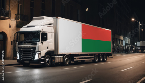 A truck with the national flag of Madagascar depicted carries goods to another country along the highway. Concept of export-import,transportation, national delivery of goods.