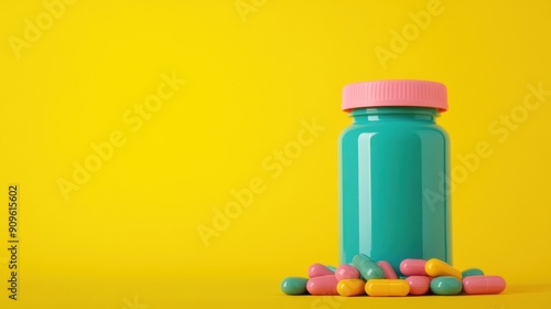 A turquoise bottle stands beside vibrant pills on a cheerful yellow background