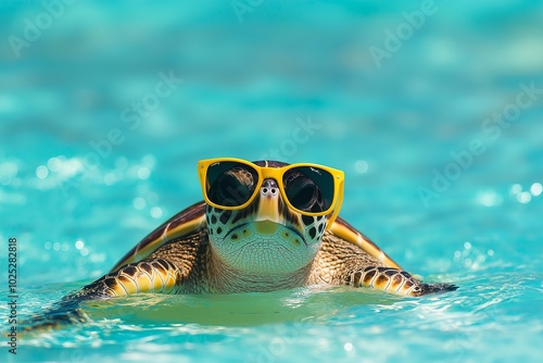 A Turtle Swimming in the Caribbean Sea Wearing Sunglasses