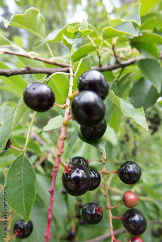 A twig with black, ripe American bird cherry berries