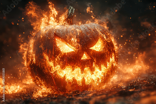 A twisted jack-o-lantern with fire pouring out of its eyes and mouth as it laughs maniacally adds a sinister touch to Halloween. Concept of fear.