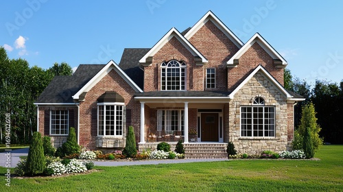 A two-story brick house with a gable roof and stone accents, surrounded by a well-maintained lawn and a garden with a variety of plants and flowers.