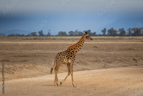 A Ugandan Giraffe crossing a dirt road in Amboseli National Park, Kenya