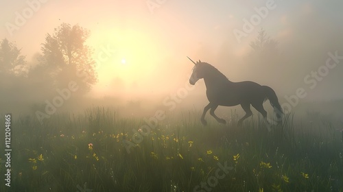 A unicorn galloping through a misty meadow at dawn.