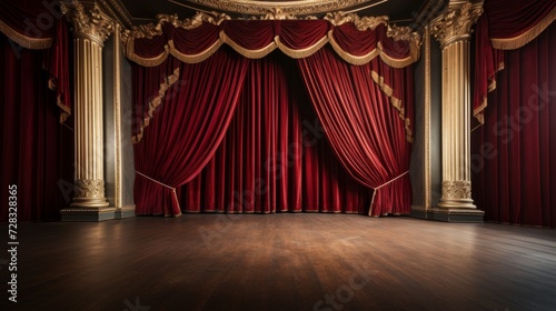 A vacant theater stage surrounded by ornate gold curtains and a majestic red velvet backdrop.