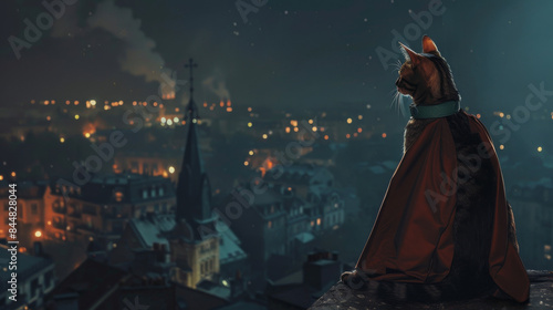 A valiant cat dressed as a superhero, with a cape and utility belt, perched on a rooftop looking out over the city at night