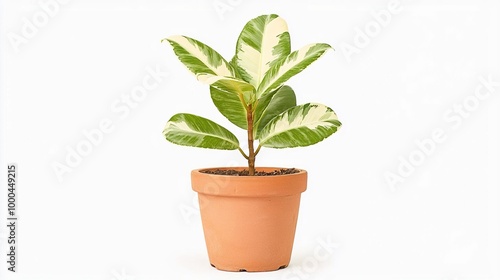 A variegated Rubber plant in a terracotta pot on solid white background, single object