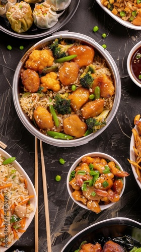 A variety of Asian dishes are laid out on a table, including rice, broccoli