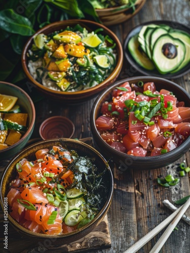 A variety of bowls of food, including sushi, sit on a wooden table. The bowls are filled with different types of food, such as avocado, broccoli, and carrots. The table is set with chopsticks
