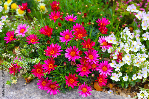 A variety of colorful flowers in full bloom at a park in Japan