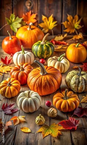pumpkin, pumpkin, gourd, squash, fall, autumn, harvest, season, seasonal, decoration, decor, fall leaf, leaf, foliage, wood, wooden, table, background, nature, organic, food, vegetable, round, orange, green, white, striped, ripened, fresh, healthy, still life, still life, variety, group, collection, abundance, country, rustic, traditional, thanksgiving, halloween, celebration, holiday, garden, farm