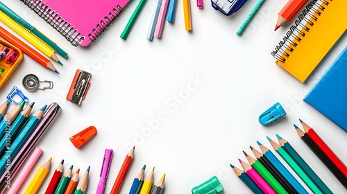 A variety of colorful school supplies, including pencils, markers, notebooks, and rulers arranged around the edges of the image with a clean white space in the center for text