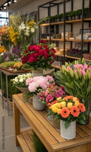 A variety of flowers displayed on a wooden table in a flower shop. Floral showcase. (Bouquet)