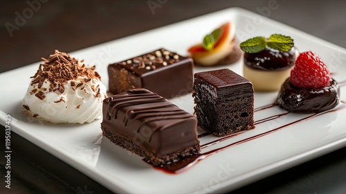 A variety of gourmet chocolate desserts displayed on an elegant platter with room for text