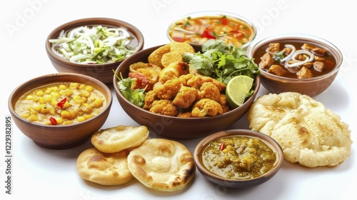 A variety of Indian curries and bread presented on a white surface, AI generated