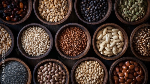 A variety of legumes, beans, grains, and seeds in wooden bowls.