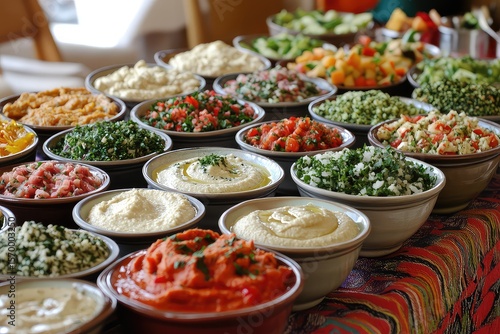 A variety of mezze dishes, including hummus, tabbouleh, and baba ghanoush, displayed on a colorful table for iftar