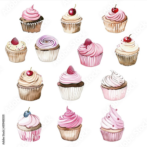 A variety ofwatercolor cupcakes with different toppings. The cupcakes are arranged in a grid pattern. The background is white.