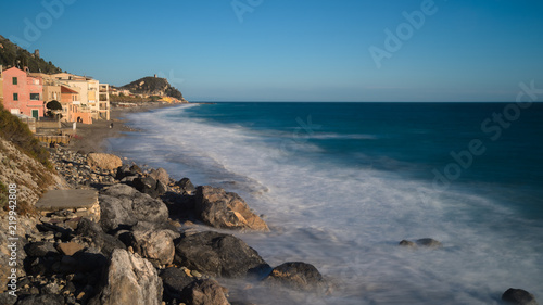 liguria, sea, beach, rock, sand, wave, water, house, view, countryside, coast, shoreline