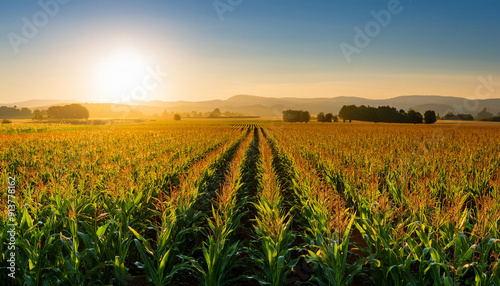 A vast cornfield at sunrise, with golden sunlight streaming through the rows of tall corn stalks, creating a serene and picturesque agricultural landscape.