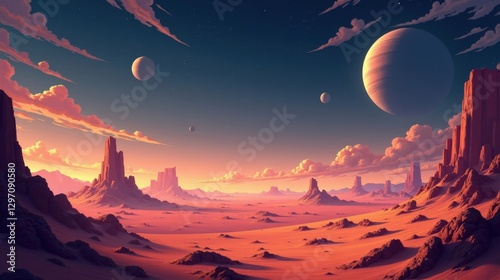 huge, desert, planet, floating, rock formation, shimmering, dune, dust, looming, sky, immensity, aethereal, vibrant, surreal, glowing, alien, cosmic, expansive, mysterious, science fiction, dramatic, planetary, isolation, barren, rugged, fantasy, mystical, strange, aglow, fantastical