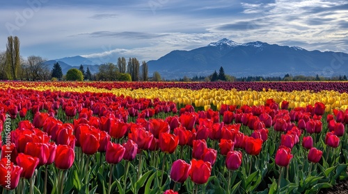 A vast expanse of colorful tulip fields in full bloom, creating a radiant display of reds, yellows, and purples in the bright daylight.
