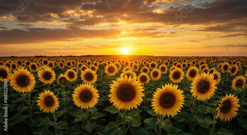 A vast expanse of sunflowers faces a vibrant sunset, bathed in warm hues of orange and gold.