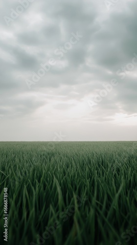 A vast field of vibrant green grass stretches to the horizon under a dramatic, overcast sky