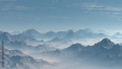 mountain, landscape, sky, misty, serene, blue, light, huge, horizon, aerial, nature, tranquil, calm, cloud, atmosphere, peak, range, hazy, textured, digital, art, image, illustration, aethereal, quiet, panoramic, vista, elevated, view, cold, cool, beautiful, colourful, bright, creative, modern, elegant, stylish, professional, decorative, vibrant, stunning, amazing, marvellously, fantastic, gorgeous, lovely
