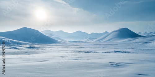 A vast, snow-covered plain with a bright sun in the sky. The scene is serene and peaceful, with the sun casting a warm glow over the landscape. The mountains in the distance add a sense of grandeur