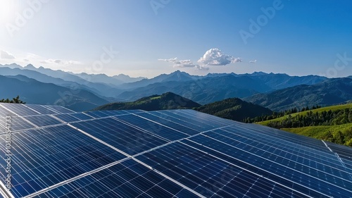 A vast solar panel installation captures sunlight against a backdrop of majestic mountains and a clear blue sky.