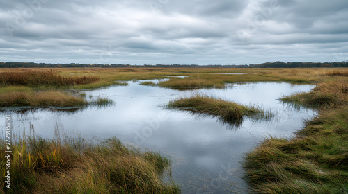 A vast wetland with pools of water and scattered patches of tall grass under an overcast sky.
