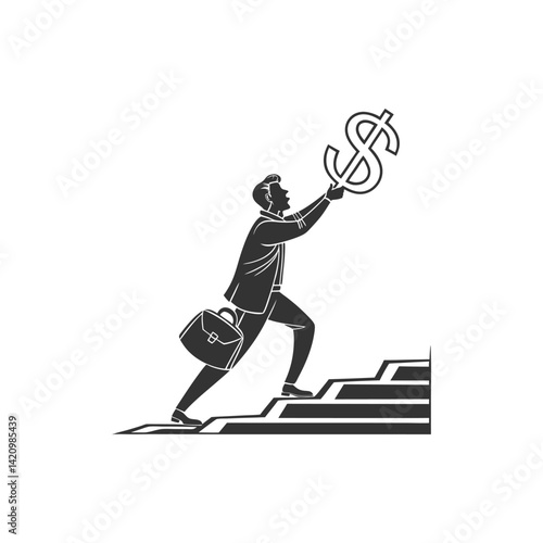 A vector illustration depicts a cartoon businessman silhouette running up stairs with a dollar sign, embodying the competitive spirit of business