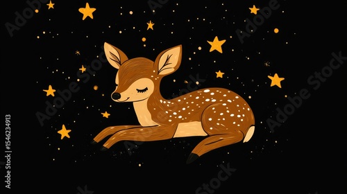 A vector illustration of a baby deer resting under a starry sky, simplified into soft cartoon shapes against a solid black background,