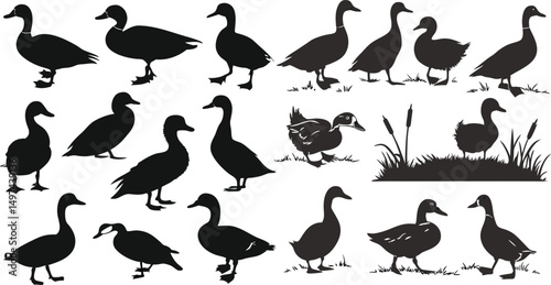 vector, set, duck, silhouette, quality, detailed, outline, standing, swimming, duck, flat, collection, bird, animal, duckling, feather, wildlife, poultry, baby, domestic, goose, illustration, isolated, shape, white, wild, black, icon, line, nature, symbol, farm, water bird, eagle, flight, fly, graphic, group, monochrome, sticker, swim, wing, colouring, drawing, hunting, beak, computer graphic, family