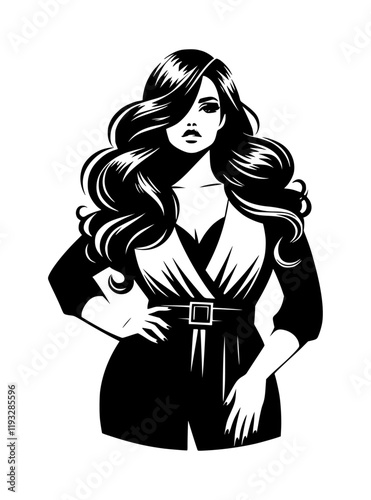 A vector silhouette of a stylish female model with long hair isolated on a white background.