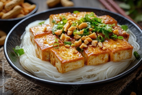 A vegetarian Asian dish featuring stir-fried tofu over a bed of noodles, served on a black plate. Garnished with nuts and herbs.