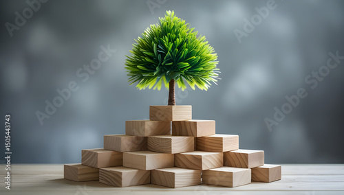 A Verdant Green Artificial Tree in a Grey Pot, Artfully Placed on a Pale Reflective Surface