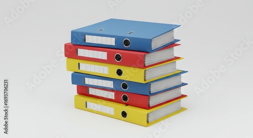stack, binder, office, organisation, document, paper, file, storage, colourful, blue, red, yellow, white, grey, object, arranged, vertical, stationery, supply, archive, collection, book, administrative, work, professional, isolated, clean, studio, rendering, ring, illustration, plain, background, group, material, cover, page, spine, label, hole, perspective, bright, organised, neat, formal, desk, educational, management