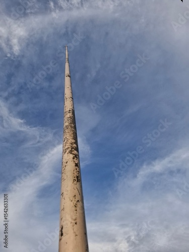 pole, tall, slender, blue skies, wispy clouds, vertical, flag pole, utility pole, dirty, weathered, texture, sky, height, weather, urban, infrastructure, structure, communication