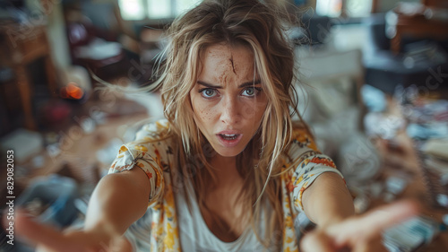 a very furious mother standing in a messy living room afterparty and pointing finger,generative ai