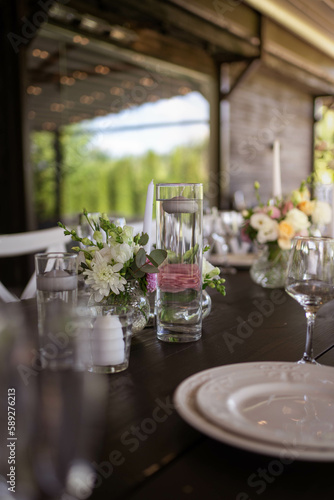 A very nicely decorated wedding table appointments with beautiful decor with plates and serviettes in spring garden. Beautiful flowers on table in wedding day. The elegant dinner table.