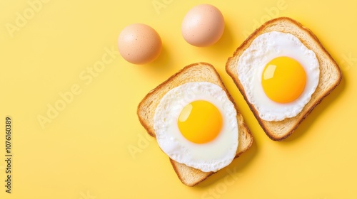 A vibrant two fried eggs on toast, accompanied by two raw eggs, set against a bright yellow background.